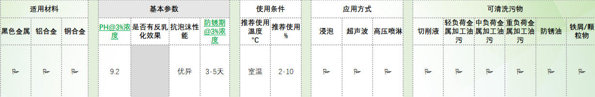 常温清洗剂,无需加热,能耗极低优异的清洗能力优异的抗泡沫性能较好的分油性能通用性强,可以用于铝,铁,铜件的清洗