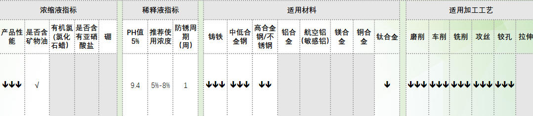 a)环保型乳化液设计,不含任何禁用物质(无甲醛无硼)b)乳化液液滴更小,带出量更少,液更稳定,寿命更长c) 润滑性能优异,适用各种类型的铁加工d) 抗杂油性能优异,抗菌性优异 e) 金属离子含量极低