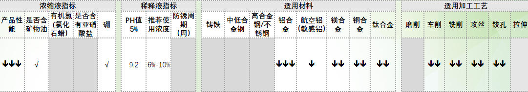 a)环保型乳化液设计,不含任何禁用物质b) 适用 压铸铝,纯铝等普通铝材的机加工, 优异的抗铝腐蚀性能 ;c) 乳化液液滴更小,带出量更少,液更稳定,寿命更长d) 使用浓度低,消耗低